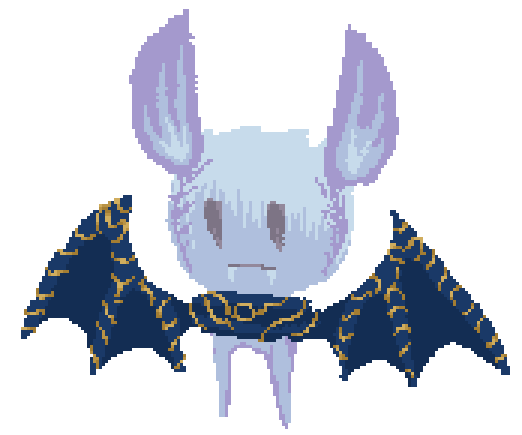 Sophi Cuevas' Capstone Project was a webcomic about a soldier-turned-vampire named Leon. For the mascot, I made a bat form for Leon with golden accessories similar to his clothes, since he is a Vampire and Sophi didn't have a bat form for him yet. The wings and scarf are based on his clothing and are a similar shade of blue as a result.