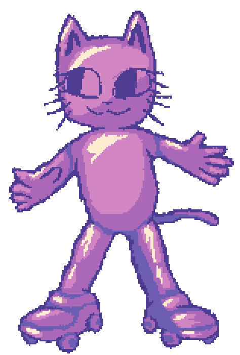 When I was coming up with a color palette, I decided to use one of Sarah's other art pieces as inspiration to add flair when it came to finding a color palette. I believe the pale-yellow streaks add a lot to the design. She asked me to make the cat pink with the background purple, which resulted in the outline for the character needing to be lighter to compensate.